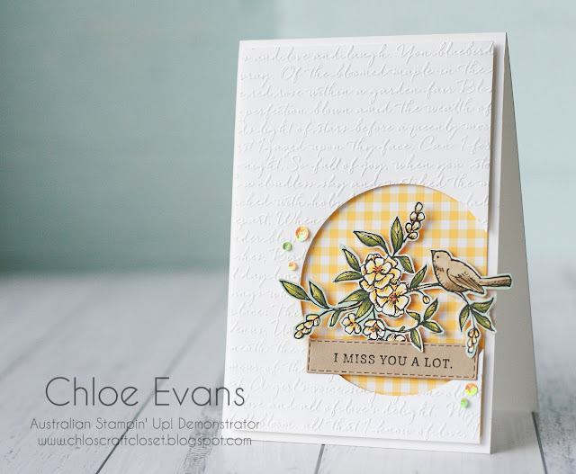 I really love and adore this Scripty embossing folder and if you haven't already added this folder to your collection, you really need to. It's simply perfect for every occasion.Oh and a quick tip. If you CASE my card, don't throw the cut out circle away. I have another set of cards to share later in the week, where I've actually used that circle.